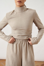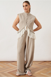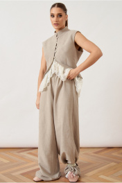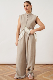 Брюки из аналогичной ткани бежевого цвета, свободного силуэта, расширенные от бедра. Модель на притачном поясе, с глубокими складками у талии. Особенностью модели является эластичная сборка по низу брючин