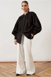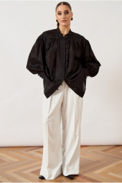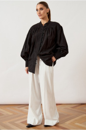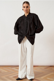 Блуза свободного силуэта (оверсайз) выполнена из струящейся плательной ткани. Модель с воротником-стойкой и центральной застежкой на ряд аккуратных жемчужных пуговиц и навесных петель. Особенностью конструкции является кокетка, переходящая в рукав, и глубокая густая сборка по линии груди и спинки, создающая объемный летящий силуэт. Плечевой пояс спущен, рукав втачной, экстремально объемный, формы «епископ», заканчивающийся высокой притачной манжетой на нескольких пуговицах. Нижний край блузы обработан узким швом вподгиб