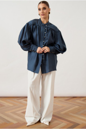 Блуза свободного силуэта (оверсайз) выполнена из струящейся плательной ткани. Модель с воротником-стойкой и центральной застежкой на ряд аккуратных жемчужных пуговиц и навесных петель. Особенностью конструкции является кокетка, переходящая в рукав, и глубокая густая сборка по линии груди и спинки, создающая объемный летящий силуэт. Плечевой пояс спущен, рукав втачной, экстремально объемный, формы «епископ», заканчивающийся высокой притачной манжетой на нескольких пуговицах. Нижний край блузы обработан узким швом вподгиб