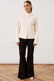 Жакет приталенного силуэта выполнен из плотной костюмной ткани молочного оттенка, на притачной подкладке. Модель с воротником-стойкой и выразительной смещенной застежкой в восточном стиле на четыре пары функциональных навесных петель и пуговиц, выполненных из основного материала. Полочка с вертикальными рельефами, обеспечивающими точную посадку по фигуре. Рукав втачной, длинный, классического кроя. Спинка со средним швом. Нижний край изделия обработан классическим швом вподгиб.