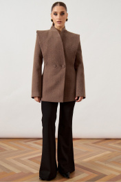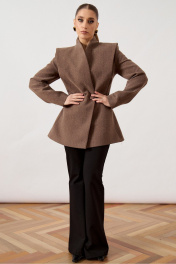Жакет приталенного силуэта выполнен из плотной шерстяной ткани коричневого цвета с меланжевым эффектом, на притачной подкладке. Модель с высоким воротником-стойкой, переходящим в глубокий асимметричный запах. Особенностью конструкции является акцентная линия плеч с широкими отлетными деталями, имитирующими лацканы, которые заходят на рукав. Центральная застежка на две крупные декоративные пуговицы, обтянутые основной тканью. Полочка с вертикальными рельефами от проймы до низа изделия, обеспечивающими плотное прилегание по фигуре. Рукав втачной, длинный, классического кроя. Спинка со средним швом.