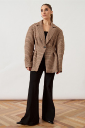 Жакет приталенного силуэта выполнен из плотной костюмной ткани в мелкую клетку «пье-де-пуль» в коричнево-бежевых тонах, на притачной подкладке. Модель отличается объемным кроем в верхней части и акцентированной линией талии. Воротник классический пиджачного типа с прямоугольными лацканами. Центральная застежка на одну крупную пуговицу контрастного черного цвета. Передняя часть жакета оформлена глубокими мягкими складками, заложенными от линии талии, что создает эффект баски и подчеркивает женственность силуэта. Рукав втачной, длинный, с наполненной головкой и свободным прилеганием по всей длине. Спинка со средним швом и вертикальными рельефами. Нижний край изделия обработан классическим швом вподгиб