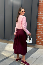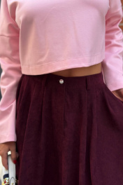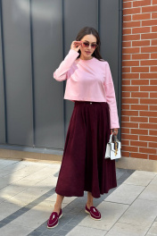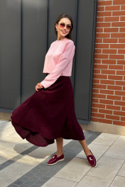 Юбка в длине миди, выполнена из неэластичной ткани. Юбка широкого силуэта, широкие клинья юбки образуют ниспадающие фалды. Застёжка -гульфик с молнией, декоративная пуговица. В боковых швах обработаны карманы