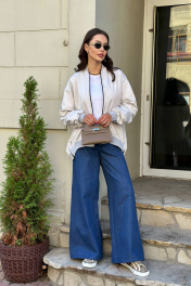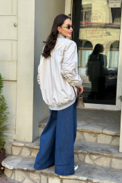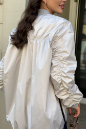 Бомбер оверсаз силуэта, выполнен из плащёвой ткани, обработан подкладкой. По низу изделия и низу рукавов, воротник притачены вставки из эластичного трикотажного полотна. Рукав и спинка присборены на резинку. По передним половинкам снизу обработаны молнии. Застёжка - разъёмная молния по центру переда