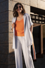 брюки+кардиган - вискоза 72%, полиэстер 25%, спандекс 3%; топ - полиэстер 80%, вискоза 17%, эластан 3%