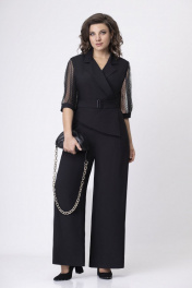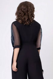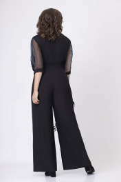 Нарядный комбинезон из костюмно-плательной ткани средней плотности, немного тянется. Застежка на молнию и кнопки спереди. Воротник пиджачного типа. Брюки прямые, широкие. Длина изделия по спинке 157 см. Длина рукава 36 см.