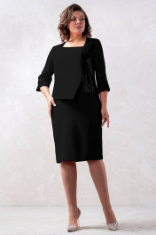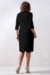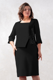 Вечернее платье полуприлегающего силуэта из костюмно-плательной ткани средней плотности, немного тянется. На переде отлетная деталь, имитирующая костюм. В среднем шве спинки шлица. Длина платья 103 см, рукава 44 см