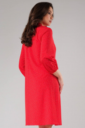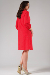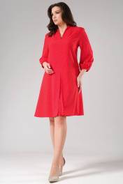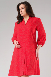 Платье из лёгкой плательной ткани А-образного силуэта. Перед платья разрезной с глубокой складкой по центру от линии бёдер. Вырез горловины V-образный. Рукав втачной, прямой, низ собран эластичной тесьмой. Длина платья по спинке в в 48-52 размерах - 101 см, в 54-58 размерах - 102 см.