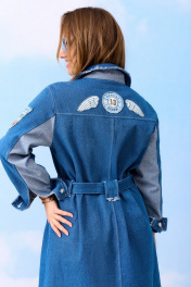 Жакет из хлопкового итальянского двустороннего джинса прямого силуэта со съемным поясом, длиной до уровня колена. Застежка на пуговицы- гвозди спереди и отложным воротником. Перед с обрезной кокеткой, нагрудными карманами с клапанами и двумя прорезными карманами. Спинка исполнена с кокеткой и средним швом. Рукав втачной, двухшовный с манжетой. Жакет декорирован авторскими вышитыми нашивками. Изделие предварительно проходит энзимную стирку, благодаря чему сырые срезы приобретают стильную истрепанность.