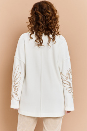 Кардиган из мягкого ворсистого трикотажа, свободного силуэта, застежкой на пуговицы и воротником пиджачного типа. Рукав длинный, линия плеча спущена. На переде накладные карманы. Некоторые швы в изделии выполнины на- лицо. Кардиган декорирован эффектной вышивкой на рукавах с применением золотистого шнура.