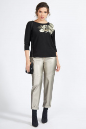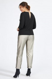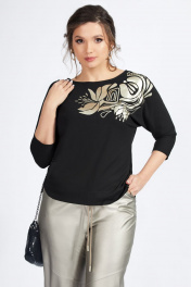 Джемпер из вискозного трикотажа, с рукавом "летучая мышь", длиной 3/4. Спинка со средним швом и V-образным вырезом, скрепленным цепочкой. На переде эффектный авторский декор из золотистой термопленки. По бокам небольшие разрезы.