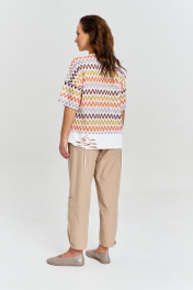 Джемпер из гипюра с геометрическим узором, свободного силуэта, с коротким рукавом и V-образной горловиной. По низу изделия притачная планка из отделочного трикотажа с декоративными прорезями и необработанными срезами. Планка декорирована авторским принтом.