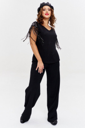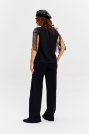 Джемпер из эластичного трикотажа с легким мерцанием, полуприлегающего силуэта, с коротким рукавом и V-образной горловиной. Рукава из сетки с пайетками с эффектной длинной бахромой.