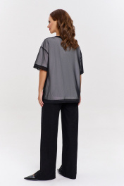 Брюки из мягкого пластичного трикотажа с эффектным мерцанием, прямого силуэта, с карманами спереди и фигурной кокеткой сзади. Пояс - декоративная резинка. Передние половинки брюк декорированы лампасами с блеском.