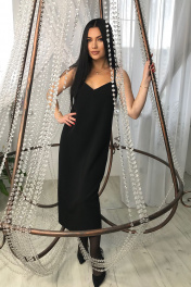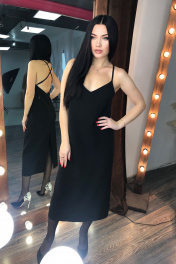 Платье комбинация длины миди с открытой спинкой. Выполнено из плотной ткани, что является выгодным преимуществом от похожих моделей платьев. Вырез горловины спинки фигурный с пересекающимися бретелями. Спинка со средним швом и застежкой на потайную тесьму-молнию для удобства эксплуатации. Длина платья по среднему шву 81 см, длина разреза п среднему шву 35 см