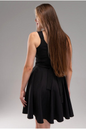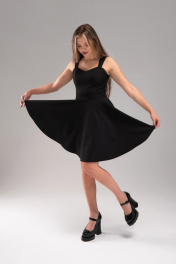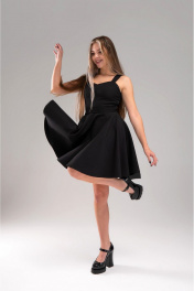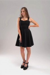 Платье коктейльное короткое полуприлегающего силуэта на широких бретелях. Отрезное по линии талии. Полочка двойная - спинка на обтачке. Юбка полусолнце. Спинка платья со средним швом, в котором обработана застежка на потайную тесьму-молнию. Длина юбки от шва притачивания 50 см(+-1см)