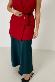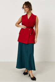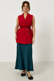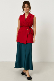 Жилет прямого кроя, из костюмной ткани красного цвета, застежка на пуговицу, по переду небольшие вытачки, по бокам изделия карманы, в комплекте съемный пояс.