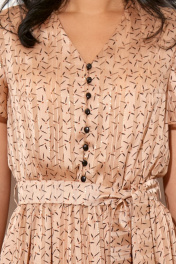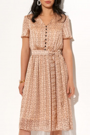 Платье (длина по спинке 105 см, цвет: песочный) - отрезное по линии талии на резинке, горловина V-образной формы; -рукав короткий, втачной; -перед, лифа с центральной застежкой на навесные петли и пуговицы, нагрудными вытачками; - спинка лифа со средним швом; - юбка прямая, по линии талии сборка; -на подкладке; - дополнением служит завязывающийся пояс;