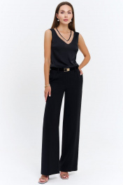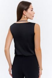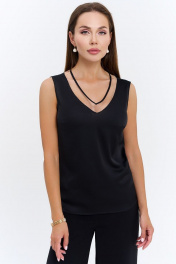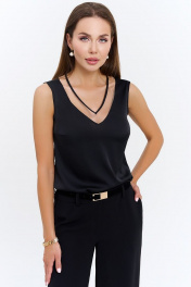 Топ (длина по спинке 42-46р - 61,5 см 48-52р - 62 см) - прямого силуэта, выполнен из нежной ткани шёлк-армани и сетки; - перед с нагрудными вытачками; - горловина V-образная, подрез горловины оформлен элементом из сетки и завершён окантовкой; - пройма обработана окантовкой