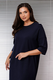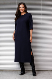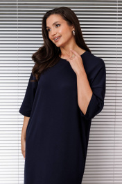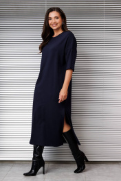 Платье женское трикотажное, свободное "оверсайз", со спущенной проймой и 3/4 рукавом, вырез горловины полукруглый с планкой, в боковых швах-карманы и разрез слева.