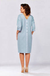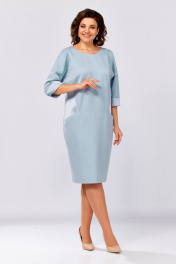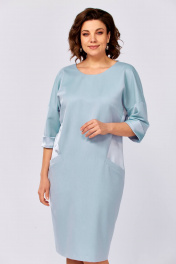 Платье женское, комбинированное из двух видов ткани- однотонной плательной и атласа. Вырез горловины-полукруглый спереди, а по спинке V- образный с планкой до низа изделия и с пуговицами. По бокам переда вставки из атласа и карманы, рукав изделия 3/4 длины с манжетной из атласа. Изделие полуприлегающее без застёжки.