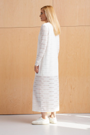 Платье женское из тонкого трикотажного полотна с неоднородной поверхностью. Изделие на подкладке из тонкого трикотажного полотна, до колена. Платье слегка прилегающего силуэта удлинённое с длинным втачным рукавом, вырез горловины полукруглый с узкой планкой. Длина 130см ОГ (44):49см (46):51см (48):53см (50):55см (52):57см ОБ (44):51см (46):53см (48):55см (50):57см (52):59см