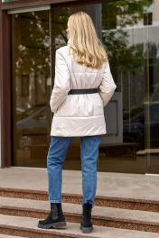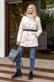 Куртка женская утепленная (до минус 10) из плащевой ткани, под съемный пояс из текстильной тесьмы, утеплитель изософт. Длина изделия ниже линии бедер, среднего объема, рукав втачной, воротник на стойке, застежка спереди на молнию и планку на кнопках, по переду карманы с листочкой. Изделие на подкладке с дизайном. Ширина по линии груди (42):51см (44):53см (46):55см (48):57см (50):59см (52):61см Ширина по линии бедер (42):56см (44):58см (46):60см (48):62см (50):64см (52):66см Длина изделия 78-79см Длина рукава 64см