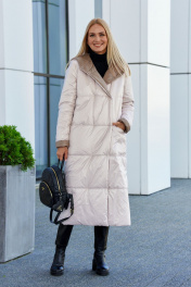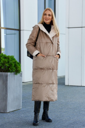 Пальто женское из плащевой ткани на утеплителе нового поколения "изософт", двухстороннее, двухцветное. Пальто прямого покроя, удлиненное, с втачным двухшовным рукавом с отложной манжетой по низу, по переду-карманы в горизонтальных рельефных швах, изделие двубортное, застегивается на кнопки, с капюшоном. Рекомендуется носить при температуре -10 и до -20 градусов. Ширина по линии груди (42):56см (44):58см (46):60см (48):62см (50):64см (52):66см (54):68см (56):69см (58):71см (60):73см Ширина по линии бедер (42):58см (44):60см (46):62см (48):64см (50):66см (52):68см (54):70см (56):71см (58):73см (60):75см Длина изделия 122-124см Длина рукава 64см