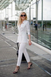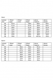 Костюм женский классический, состоит из жакета и брюк. Жакет полуприлегающего силуэта с втачным рукавом, по низу рукава шлица с пуговицами. Спереди два прорезных кармана и украшение. По спинке шлица, изделие на подкладке с дизайном(дизайн может меняться. Брюки-зауженные книзу 7/8 длины, с боковыми карманами, на поясе, спереди застегивается на молнию и пуговицы. Ширина по линии груди размер(42):45см размер(44):47см размер(46):49см размер(48):51см размер(50):53см размер(52):55см размер(54):57см размер(56):59см размер(58):61см размер(60):63см Ширина по линии бедер жакет(42):48см; брюки(42):46см жакет(44):50см; брюки(44):48см жакет(46):52см; брюки(46):50см жакет(48):54см; брюки(48):52см жакет(50):56см; брюки(50):54см жакет(52):58см; брюки(52):56см жакет(54):60см; брюки(54):58см жакет(56):62см; брюки(56):60см жакет(58):64см; брюки(58):62см жакет(60)66см; брюки(60):64см Ширина по линии талии брюки(42):35см брюки(44):37см брюки(46):39см брюки(48):41см брюки(50):44см брюки(52):46см брюки(54):48см брюки(56):50см брюки(58):52см брюки(60):54см Длина изделия размеры (42-48): жакет - 68см брюки - 96см размеры (50-54): жакет - 69см брюки - 97см размеры (56-60 ) жакет-69,5см брюки: 98см Длина рукава 62 см