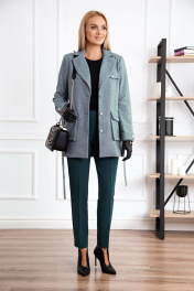 Комплект женский брючный, состоящий из жакета и брюк из разных видов ткани. Жакет из теплой костюмной ткани с низким ворсом прямого силуэта под пояс из той же ткани. Воротник отложной с лацканами , рукав втачной, по переду –накладные карманы с клапанами и пуговицами по нижней части жакета и один клапан –слева по верхней части переда. Изделие на подкладке. Брюки прямые ,зауженные книзу,на поясе-кокетке с застежкой спереди на молнию и пуговицы ,с боковыми карманами со скосом,со стрелками. Ширина по линии груди жакет(44):53см жакет(46):55см жакет(48):57см жакет(50):59см жакет(52):61см жакет(54):63см Ширина по линии бедер жакет(44):54см брюки:50см жакет(46):56см брюки:52см жакет(48):58см брюки:54см жакет(50):60см брюки:56см жакет(52):62см брюки:58см жакет(54):64см брюки :60см Ширина по линии талии брюки(44):38,5см брюки(46):40,5см брюки(48):42,5см брюки(50):44,5см брюки(52):46,5cм брюки(54):48,5см Длина изделия жакет - 78см брюки -101см Длина рукава 61см