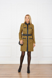 Платье женское из ткани с отделкой из кожзаменителя на хлопчато-бумажной основе.полуприлегающего силуэта с втачным рукавом ,с застежкой спереди на планку с пуговицами ,с отложным воротником на стойке,с накладными карманами по переду выше линии груди и на линии бедер,под пояс съемный из кожзаменителя.Изделие на подкладке. Ширина по линии груди размер(42):49см размер(44):51см размер(46):53см размер(48):55см размер(50):57см размер(52):59см Ширина по линии бедер размер(42):52см размер(44):54см размер(46):56см размер(48):58см размер(50):60см размер(52):62см Длина изделия 91,5см Длина рукава 62см