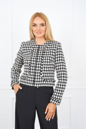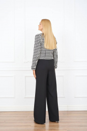Комплект женский состоит из жакета и брюк. Жакет прямого силуэта из ткани "гусек", укороченный, без воротника, рукав втачной, застежка на крючки, спинка цельная с вытачками, жакет отделан бахромой из той же ткани, на подкладке. Брюки прямые широкие на поясе-кокетке частично с эластичной тесьмой, застежка спереди на молнию и пуговицы, по передним половинкам карманы со скосом. Ширина по груди жакет(44):46см жакет(46):50см жакет(48):52см жакет(50):54см жакет(52):56см жакет(54):58см Ширина по бедрам жакет(44):46см; брюки(44):49см жакет(46):48см; брюки(46):51см жакет(48):50см; брюки(48):53см жакет(50):52см; брюки(50):55см жакет(52):54см; брюки(52):57см жакет(54):56см; брюки(54):59см Ширина по талии брюки(44):37см брюки(46):39см брюки(48):41см брюки(50):43см брюки(52):45см брюки(54):47см Длина изделия (44-48) жакет-48см, брюки-114см (50-54): жакет-49,5см, брюки-114см