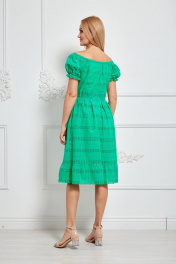 Платье женское из вышитой ткани с хлопком и однотона. Прилегающего силуэта с расклешённым низом, длиной до колена, вырез горловины глубокий, фиксируется эластичной тесьмой, рукав пышный со сборками, по спинке в среднем шве потайная молния, по низу изделия волан, платье на подкладке. Ширина по линии груди (44):47см (46):49см (48):51см (50):53см (52):55см (54):57см Ширина по линии бедер (44):65см (46):67см (48):69см (50):71см (52):73см (54):75см Длина от талии:65-67см Рукав 23-25см