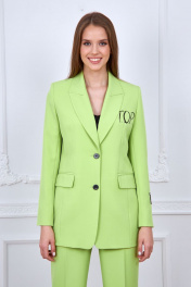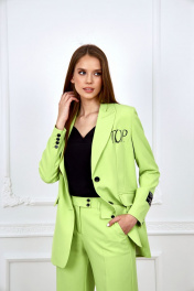 Комплект женский брючный –тройка, состоящий из жакета, брюк и блузки .Жакет свободный удлиненный ,полуприлегающего силуэта, с втачным рукавом ,с отложенным воротником и лацканами ,по переду прорезные карманы с клапанами ,в верхней части слева –печать в виде букв ,крой борта закругленный ,застежка спереди на петли и пуговицы ,спинка со среднем швом и рельефами. Изделие на подкладке. Брюки прямые ,свободные ,с боковыми карманами и отделочными клапанами по передним половинкам . Блузка на бретелях с V-образным вырезом , с закругленными по бокам швам ,по спинке эластичная тесьма по талии. Ширина по линии груди жакет(42):47см жакет(44):49см жакет(46):51см жакет(48):53см жакет(50):55см жакет(52):57см жакет(54):59см Ширина по линии бедер блузка(42):47см жакет:50см, брюки(42) 48см блузка(44):49см жакет:52см, брюки(44) 50см блузка(46):51см жакет:54см брюки(46) 52см блузка(48):53см жакет:56 см брюки(48) 54см блузка(50):55см жакет:58 см брюки(50) 56см блузка(52):57см жакет:60 см брюки(52) 58см блузка(54):59см жакет:62 см брюки (54) 60см Ширина по линии талии брюки(42):35см брюки(44):37см брюки(46):39см брюки(48):41см брюки(50):43см брюки(52):45см брюки(54):47см Длина изделия размеры(42-48): жакет - 76см блузка 43см брюки -113см размеры(50-54): жакет - 77см блузка -45см брюки -114см Длинна рукава Жакет:63см