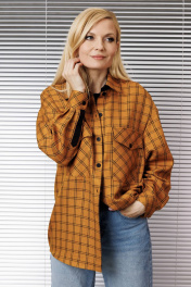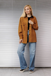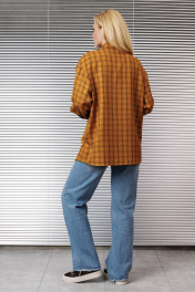 Блузка женская свободного покроя со спущенной и углублённой проймой и втачным рукавом с манжетой по низу рукава. По переду накладные карманы по линии груди, воротник рубашечный на стойке, застёжка спереди на петли и пуговицы.Низ изделия фигурный.