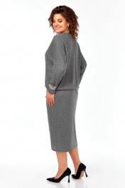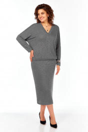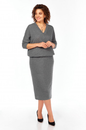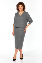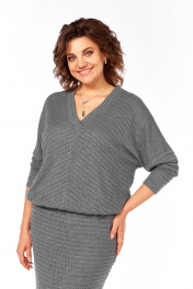 Женский двухпредметный костюм,состоящий из джемпера и юбки, выполнен из фактурного трикотажного полотна с геометрическим рисунком. Джемпер свободного силуэта,со спущенной линией плеча и длинным рукавом.Перед со средним швом и V-образным вырезом горловины,обработаным планками внахлёст, внизу декоративное металлическое украшение . Низ джемпера на двойном притачном поясе с резинкой по кругу. Юбка прилегающего силуэта длиной миди,с цельнокроеным поясом с резинкой по кругу,на трикотажной подкладке.