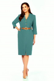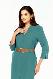 Женское платье полуприлегающего силуэта выполнено из однотонной плательно-костюмной ткани. Платье с центральной застёжкой на 3 петли и пуговицы . Перед со средним швом заканчивающимся шлицей, рельефами из пройм до боковых швов,в швах выполнены карманы,и нагрудными вытачками.Спинка цельная.По переду и спинке в области талии выполнены шлевки для ремня. Рукава втачные , двухшовные, длиной 3/ 4. Внизу верхнего шва рукава декоративные пуговицы и разрез. Вырез горловины фигурный со стойкой. Платье укомплектовано поясом из экокожи . Пояс может быть отличаться от фото.