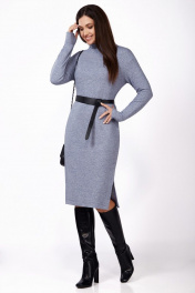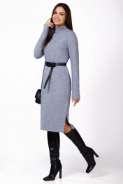 Платье женское полуприлегающего силуэта выполнено из трикотажного полотна в рубчик.Перед и спинка с цельнокроеным воротником- стойкой.Проймы слегка спущены.Слева вдоль бокового шва шлица.Рукава длинные с цельнокроеными митенками. Платье укомплектовано поясом из экокожи.