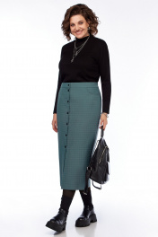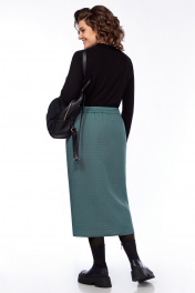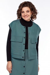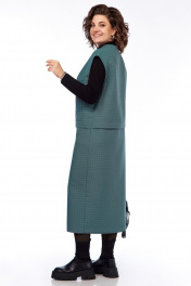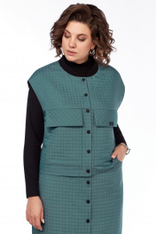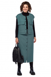Стильный женский костюм тройка,состоящий из жилета и юбки, выполненных из плательно-костюмной ткани под "стежку" и джемпера-водолазки из трикотажного полотна "лапша". Жилет прямого силуэта с центральной застёжкой на кнопки.Перед с отрезной кокеткой и накладными карманами с клапанами,на левом декоративный лейбл.Спинка цельная.Горловина обработана бейкой из довяза.Плечо спущено.Жилет без подкладки. Юбка слегка зауженная к низу,длиной ниже середины икры, с центральной застёжкой на 3 кнопки в верхней части,а остальные декоративные(имитация распашной) и карманами с отрезным бочком,на притачном поясе с резинкой по спинке.Без подкладки. Джемпер полуприлегающего силуэта с длинными втачными одношовными рукавами и воротником -стойка.