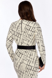Женское платье полуприлегающего силуэта выполнено из трикотажного полотна с оригинальным дизайном.Перед с отрезными бочками от проймы до бокового шва ,в шве выполнены карманы.Спинка с талиевыми вытачками ,со средним швом, застёжкой на декоративную тесьму-молнию и разрезом.Рукава втачные длинные двухшовные.Платье укомплектовано ремнем из искусственной кожи.