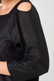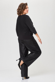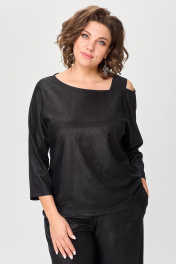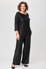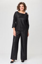 Костюм женский, состоящий из блузки и брюк. Простота кроя, компенсируется выбором ткани, относя костюм к нарядной одежде. Легкое мерцание придает костюму таинственность и элегантность. Свободный крой позволяет чувствовать себя комфортно, будь то домашнее торжество или вечеринка. Блузка с цельнокроенным рукавом и ассиметричным решением горловины. Левая часть горловины по плечу фиксируется широкой шлейкой. Брюки прямого кроя с притачным поясом на резинку вкруговую.