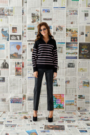 Брюки женские, текстильные - эко кожа, слегка заужены к низу. По переду расположена застежка на молнию и пуговицу с гульфиком,а так же боковые карманы. На задней половине брюк расположены накладные карманы. Пояс притачной, со шлёвками.