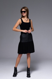 Длина: 58 см. Юбка женская, А- силуэта. Текстиль по линию бёдер. Низ изделия - трикотаж в складку. По переду изделия застёжка с гульфиком и боковые карманы .На заднем полотнище расположены накладные карманы. Пояс текстильный со шлёвками.