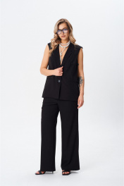 Женский комплект двух предметный, состоящий из жилета и брюк. Жилет полуприлегающего силуэта, на подкладке. Застежка однобортная на две петли и пуговицы. Вырез V-образный, воротник пиджачного типа с лацканами. По полочке вытачки. Без рукавов. На полочках на уровне бедер прорезные карманы в рамку. Спинка со средним швом. Брюки прямые, на притачном поясе со шлёвками. По бокам в поясе вставлена широкая резинка. Застежка молния в гульфике. В боковых швах карман с отрезным бочком.