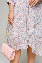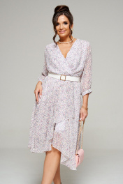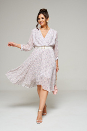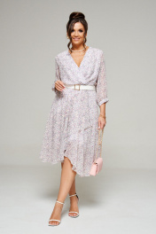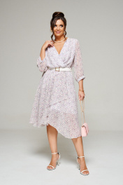 Платье выполнено из легкой, струящейся ткани шифон на трикотажной подкладке. Отрезное по линии талии, на резинке. Конструкция передней части изделия выполнена в полюбившемся многим стиле «на запах». Передняя верхняя часть с двумя вертикальными нагрудными складками. Верхняя и нижняя часть спинки цельная. Нижняя часть платья расширена по типу "большой клеш" с дополнительными вставками в виде воланов по переду. Рукав ¾, одношовный, втачной. Низ рукава оформлен разрезом с манжетой на одну пуговицу. Горловина V-образной формы. Задняя часть горловины обработана окантовкой. В комплекте присутствует дополнительный элемент в виде пояса на пряжке.