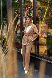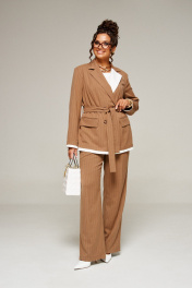 Деловой комплект 3-ка, состоящий из трех предметов: жакета, брюк и блузки. Блузка полуприлегающего силуэта. Горловина округлой формы. В боковых швах снизу разрезы. Перед цельный, с двумя нагрудными вытачками от бокового шва. Спинка разрезная по среднему шву с двумя вытачками на уровне талии. В верхней части среднего шва предусмотрен небольшой разрез с фиксацией на одну навесную петлю и пуговицу. Брюки классические прямые длинные. В верхней части брюк расположены функциональные карманы. Посадка стандартная высокая. Пояс притачной с резинкой по кругу. Жакет классический двубортный прямого силуэта длиной ниже бедер и с декоративными элементами в виде контрастных беек. К жакету прилагается пояс-завязка. Передняя часть с вертикальными рельефами от проймы и с прорезными боковыми карманами в рамку с клапаном. Спинка с центральным швом и с вертикальными рельефами от проймы. Рукав втачной двухшовный длинный. Воротник стояче-отложной с лацканами пиджачного типа. Низ борта прямой. Застёжка смещенная на две основные и одну потайную петли и пуговицы. Оригинальность модели придают контрастные левый лацкан и бейки по низу изделия и рукавам.