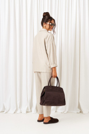 Стильный повседневный женский костюм в винтажном стиле, дополненный акцентным асимметричным накладным карманом, весьма актуален в будущем сезоне. Предметы костюма можно смело комбинировать по отдельности с другими вещами гардероба. Костюм состоит из 2-х предметов одежды: рубашки и брюк. Выполнен из костюмной ткани стильного дизайна с содержанием натуральных волокон. Рубашка прямого силуэта свободного кроя. Перед из двух симметричных деталей с нагрудными вытачками от бокового шва. Асимметричность изделию придает нижний накладной карман слева фантазийной формы. Спинка цельная. Рукав рубашечный одношовный полной длины с возможностью отворота. Застежка передняя центральная на три прорезные петли и декоративные пуговицы. V-образный вырез горловины. Воротник типа «апаш», цельнокроеный с передом. Брюки прямого силуэта свободные вверху и слегка зауженные к низу, длиной до щиколотки, с двумя верхними боковыми карманами и двумя заложенными глубокими складками от пояса спереди. Высота сиденья классическая. Застежка центральная на молнию и на петлю с пуговицей на поясе. Брюки на притачном поясе, в задней части которого для удобного прилегания по талии вставлена резинка.