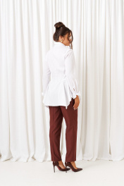 Созданный отличительным кроем с подчеркнутыми деталями, комплект задаст уверенное настроение образу и подчеркнет индивидуальность при любом случае выхода. Выразительный комплект состоит из жилета, брюк и рубашки, выполнен из смесовой ткани с натуральными волокнами, практичен в носке. Жилет полуприлегающего силуэта, двубортный, асимметричный разноуровневый. На подкладке. Передняя часть из двух половинок, с вертикальными рельефами от плеча. На левой полочке расположен прорезной нижний карман с обтачкой и клапаном, вырез горловины оформлен пиджачным воротником с лацканом. Правая полочка укорочена и без дополнительных элементов. Спинка со средним швом и с вертикальными рельефами от плеча. Правый рельеф заканчивается функциональным разрезом-шлица. Застёжка смещенная на потайные петли и пуговицы. Низ борта округлый. Дополнительным элементом служит декоративный пояс из экокожи. Брюки классические, длиной до щиколотки, слегка заужены внизу, с высокой посадкой. В верхней части спереди брюк расположены функциональные карманы и складки от пояса. Застежка центральная на молнию. Пояс широкий, с застёжкой на две пуговицы. В задней части пояса брюк вставлена резинка. Блузка рубашечного типа выполнена из хлопковой ткани. Передняя часть блузки с нагрудными вытачками и с подрезными боковыми частями. Спинка цельная по середине, с подрезными боковыми частями и защипами на талии. Блузка с декоративными вставками в нижней части, которые задают силуэтное расширение в области бедер. Нижний край блузы неровный. Воротник рубашечный, на стойке. Застежка центральная на петли и пуговицы. Рукав длинный, одношовный, втачной. Нижний край рукава обработан широкой манжетой с застежкой на петлю и пуговицу. При желании потребителя манжета может быть использована в подвернутом виде. Длина жилета (по среднему шву спинки) – 69 см. Длина рукава жакета – 21,5 см Длина брюк (по боковому шву с поясом) – 100 см.