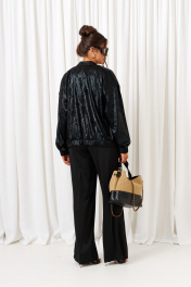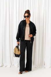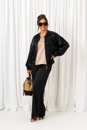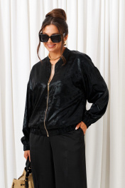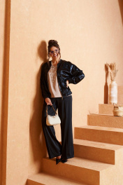 Брючный комплект в комбинации сияющего роскошного атласа с эксклюзивным ворсовым шифоном не останется незаметным! Блузон свободного силуэта тип «бомбер» с удлиненной линией плеча. Перед с нагрудными вытачками от бокового шва. Спинка цельнокроеная. Рукав рубашечный одношовный длинный. Низ рукава обработан притачной манжетой с резинкой. Горловина округлой формы с плосколежащим воротником-стойкой. Застежка центральная на декоративную разъёмную молнию. Нижняя часть блузона обработана планкой с резинкой. Брюки свободного силуэта прямые, с двумя верхними боковыми функциональными карманами. Высота сиденья классическая. Застежка центральная на молнию и на петлю с пуговицей на поясе. Брюки на поясе, в задней части которого для удобного прилегания по талии вставлена резинка. Топ полуприлегающего силуэта. Перед цельный, с двумя нагрудными выточками от бокового шва. Спинка разрезная по среднему шву, в верхней части которого предусмотрен небольшой разрез для застежки на одну навесную петлю с пуговицей; с вытачками на талии. Горловина округлой формы. В боковых швах выполнены разрезы.