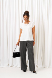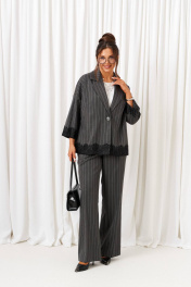 Комплект женский 3-ка, состоящий из жакета, брюк и блузки. Предназначен для повседневного использования. Жакет и брюки выполнены из костюмной ткани высокого качества нежной фактуры, приятной на ощупь, и актуального дизайна в полоску, с кружевной отделкой. Блузка изготовлена из вискозного полотна с содержанием натуральных волокон. Жакет свободного силуэта мягких линий с удлиненной линией плеча. Перед с вытачками от бокового шва. Спинка с центральным швом. Рукав рубашечного типа, длинной 7/8. Воротник классический пиджачного типа с лацканами. Застежка центральная на декоративную пуговицу. По низу жакета и рукавов настрочена отделочная кружевная тесьма с фестонным краем. Брюки прямого силуэта классической посадки, длинные, с двумя верхними боковыми карманами и двумя заложенными глубокими складками от пояса. Высота сиденья классическая. Застежка центральная на молнию и на две петли и пуговицы на поясе. В задней части пояса для удобного прилегания по талии вставлена резинка. Блузка полуприлегающего силуэта. Горловина округлой формы. В боковых швах снизу разрезы. Перед цельный, с двумя нагрудными выточками от бокового шва. Спинка разрезная по среднему шву с двумя выточками на уровне талии. В верхней части среднего шва предусмотрен небольшой разрез с фиксацией на одну навесную петлю и пуговицу. Длина жакета (по среднему шву спинки) ~ 66,5 см. Длина рукава жакета (от спущенного плеча) ~ 34 см Длина брюк (по боковому шву с поясом) ~ 109 см. Длина блузки (по среднему шву спинки) ~ 61 см.
